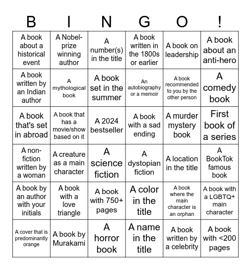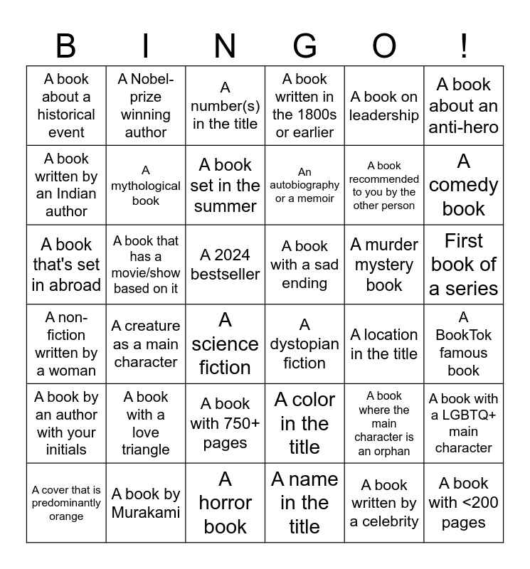 This bingo card has 36 words: A color in the title, A book with 750+ pages, A name in the title, A book written by an Indian author, A non-fiction written by a woman, A book with a sad ending, A mythological book, A horror book, A book on leadership, A book where the main character is an orphan, A comedy book, A book written in the 1800s or earlier, A book with a LGBTQ+ main character, A book that has a movie/show based on it, An autobiography or a memoir, A book about a historical event, A book by an author with your initials, A murder mystery book, A book that's set in abroad, A number(s) in the title, A 2024 bestseller, A creature as a main character, A dystopian fiction, A science fiction, A location in the title, A Nobel-prize winning author, A book recommended to you by the other person, A book by Murakami, A book set in the summer, A book about an anti-hero, A book with <200 pages, A cover that is predominantly orange, A BookTok famous book, First book of a series, A book with a love triangle and A book written by a celebrity.
