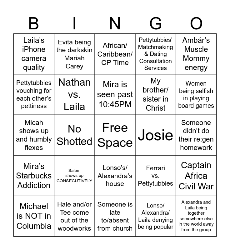 This bingo card has a free space and 24 words: Salem shows up CONSECUTIVELY, Hale and/or Tee come out of the woodworks, Mira is seen past 10:45PM, Michael is NOT in Columbia, Ambár’s Muscle Mommy energy, Laila’s iPhone camera quality, Pettytubbies vouching for each other’s pettiness, Evita being the darkskin Mariah Carey, Josie, Lonso’s/ Alexandra’s house, My brother/ sister in Christ, Micah shows up and humbly flexes, Ferrari vs. Pettytubbies, Captain Africa Civil War, Nathan vs. Laila, Lonso/ Alexandra/ Laila denying being popular, Someone didn’t do their re:gen homework, African/ Caribbean/ CP Time, Women being selfish in playing board games, No Shotted, Alexandra and Laila being together somewhere else in the world away from the group, Mira’s Starbucks Addiction, Pettytubbies’ Matchmaking & Dating Consultation Services and Someone is late to/absent from church.