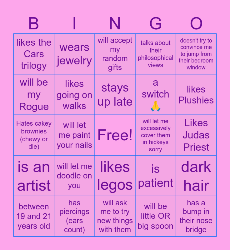 This bingo card has a free space and 24 words: between 19 and 21 years old, will let me doodle on you, stays up late, will be little OR big spoon, doesn't try to convince me to jump from their bedroom window, likes the Cars trilogy, wears jewelry, will accept my random gifts, will let me excessively cover them in hickeys sorry, Likes Judas Priest, Hates cakey brownies (chewy or die), likes going on walks, is patient, dark hair, will be my Rogue, has piercings (ears count), will ask me to try new things with them, talks about their philosophical views, likes Plushies, is an artist, will let me paint your nails, likes legos, a switch 🙏 and has a bump in their nose bridge.