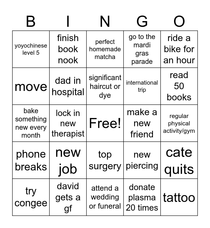 This bingo card has a free space and 24 words: new job, david gets a gf, significant haircut or dye, try congee, ride a bike for an hour, yoyochinese level 5, move, finish book nook, make a new friend, top surgery, international trip, bake something new every month, new piercing, cate quits, dad in hospital, donate plasma 20 times, regular physical activity/gym, perfect homemade matcha, read 50 books, lock in new therapist, tattoo, phone breaks, go to the mardi gras parade and attend a wedding or funeral.