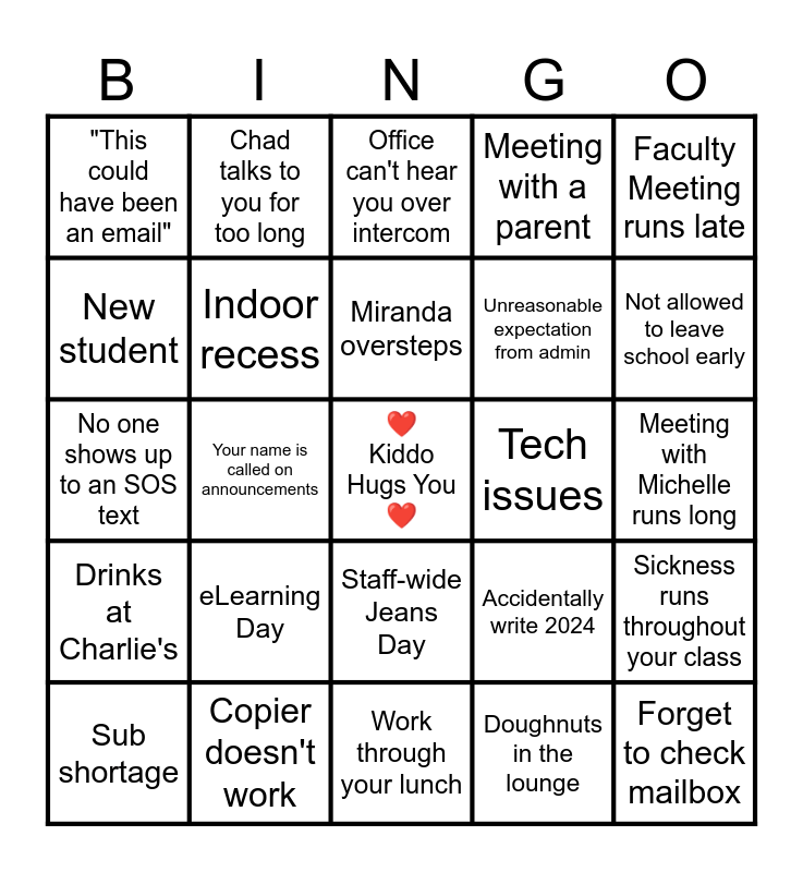 This bingo card has a free space and 24 words: eLearning Day, Copier doesn't work, Miranda oversteps, Sub shortage, Faculty Meeting runs late, "This could have been an email", New student, Chad talks to you for too long, Tech issues, Staff-wide Jeans Day, Unreasonable expectation from admin, No one shows up to an SOS text, Accidentally write 2024, Sickness runs throughout your class, Indoor recess, Doughnuts in the lounge, Meeting with Michelle runs long, Office can't hear you over intercom, Not allowed to leave school early, Your name is called on announcements, Forget to check mailbox, Drinks at Charlie's, Meeting with a parent and Work through your lunch.