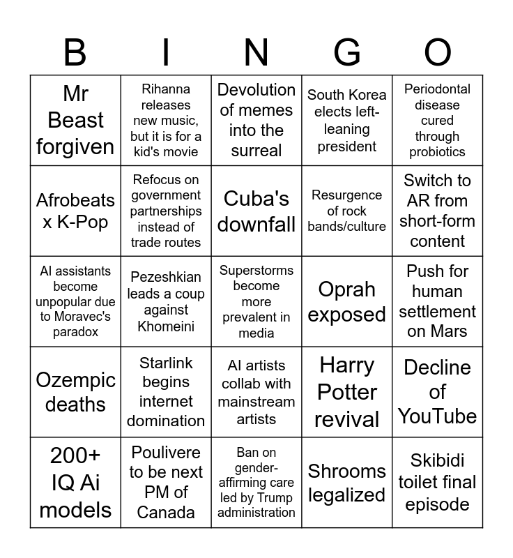 This bingo card has a free space and 24 words: Starlink begins internet domination, Poulivere to be next PM of Canada, Cuba's downfall, 200+ IQ Ai models, Periodontal disease cured through probiotics, Mr Beast forgiven, Afrobeats x K-Pop, Rihanna releases new music, but it is for a kid's movie, Oprah exposed, AI artists collab with mainstream artists, Resurgence of rock bands/culture, AI assistants become unpopular due to Moravec's paradox, Harry Potter revival, Decline of YouTube, Refocus on government partnerships instead of trade routes, Shrooms legalized, Push for human settlement on Mars, Devolution of memes into the surreal, Switch to AR from short-form content, Pezeshkian leads a coup against Khomeini, Skibidi toilet final episode, Ozempic deaths, South Korea elects left-leaning president and Ban on gender-affirming care led by Trump administration.