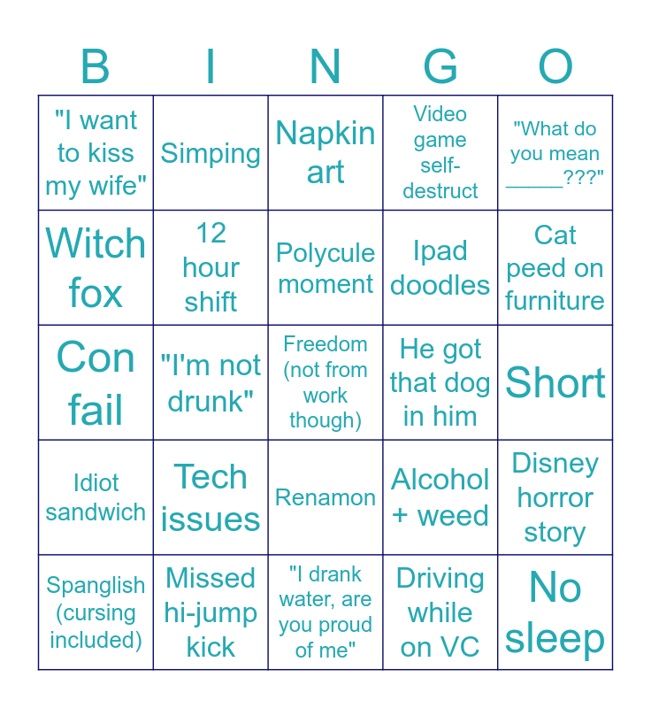 This bingo card has a free space and 24 words: Tech issues, Missed hi-jump kick, Polycule moment, Spanglish (cursing included), "What do you mean _____???", "I want to kiss my wife", Witch fox, Simping, He got that dog in him, Renamon, Ipad doodles, Con fail, Alcohol + weed, Disney horror story, 12 hour shift, Driving while on VC, Short, Napkin art, Cat peed on furniture, "I'm not drunk", No sleep, Idiot sandwich, Video game self-destruct and "I drank water, are you proud of me".