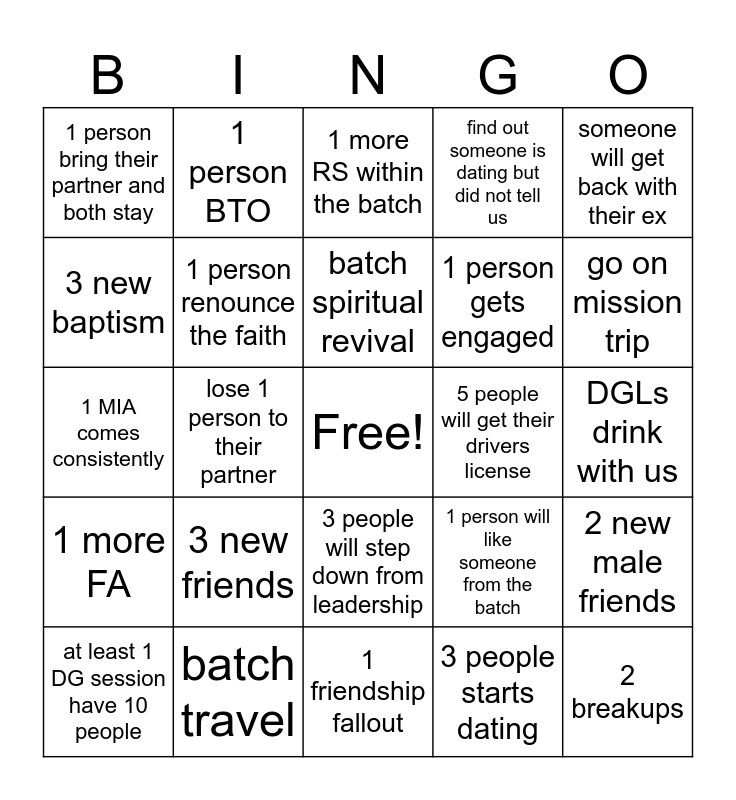 This bingo card has a free space and 24 words: 3 new friends, batch travel, batch spiritual revival, at least 1 DG session have 10 people, someone will get back with their ex, 1 person bring their partner and both stay, 3 new baptism, 1 person BTO, 5 people will get their drivers license, 3 people will step down from leadership, 1 person gets engaged, 1 MIA comes consistently, 1 person will like someone from the batch, 2 new male friends, 1 person renounce the faith, 3 people starts dating, DGLs drink with us, 1 more RS within the batch, go on mission trip, lose 1 person to their partner, 2 breakups, 1 more FA, find out someone is dating but did not tell us and 1 friendship fallout.