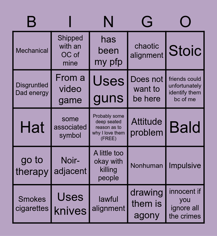 This bingo card has a free space and 24 words: Noir-adjacent, Uses knives, Uses guns, Smokes cigarettes, Stoic, Mechanical, Disgruntled Dad energy, Shipped with an OC of mine, Attitude problem, A little too okay with killing people, Does not want to be here, Hat, Nonhuman, Impulsive, From a video game, drawing them is agony, Bald, has been my pfp, friends could unfortunately identify them bc of me, some associated symbol, innocent if you ignore all the crimes, go to therapy, chaotic alignment and lawful alignment.