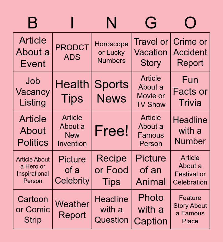 This bingo card has a free space and 24 words: Picture of a Celebrity, Weather Report, Sports News, Cartoon or Comic Strip, Crime or Accident Report, Article About a Event, Job Vacancy Listing, PRODCT ADS, Article About a Famous Person, Recipe or Food Tips, Article About a Movie or TV Show, Article About Politics, Picture of an Animal, Article About a Festival or Celebration, Health Tips, Photo with a Caption, Headline with a Number, Horoscope or Lucky Numbers, Fun Facts or Trivia, Article About a New Invention, Feature Story About a Famous Place, Article About a Hero or Inspirational Person, Travel or Vacation Story and Headline with a Question.