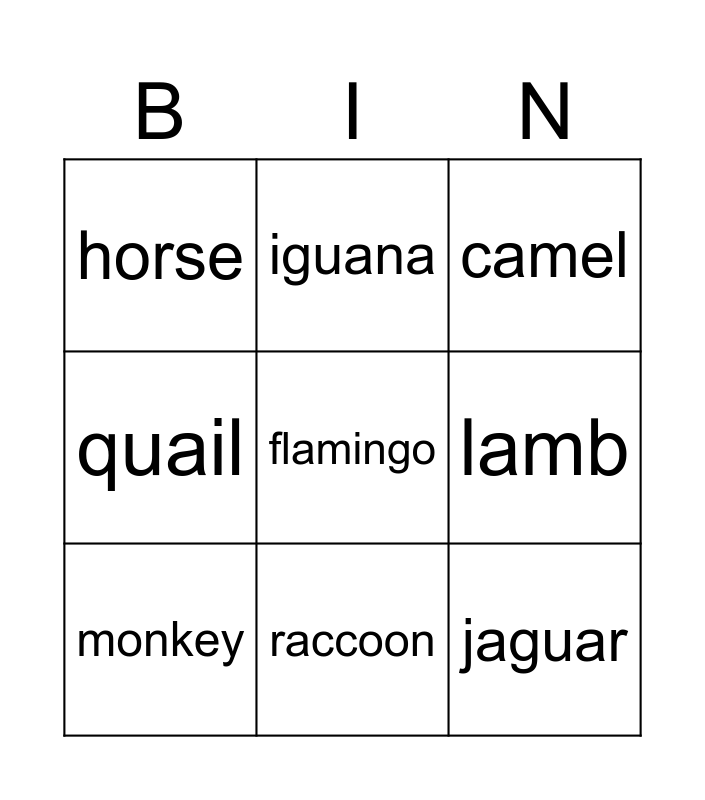 This bingo card has 19 words: alpaca, bat, camel, dolphin, elephant, flamingo, gorilla, horse, iguana, jaguar, koala, lamb, monkey, nightingale, octopus, penguin, quail, raccoon and snake.