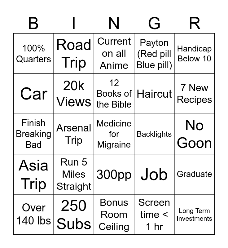 This bingo card has 25 words: Run 5 Miles Straight, Bonus Room Ceiling, 12 Books of the Bible, Over 140 lbs, Handicap Below 10, 100% Quarters, Car, Road Trip, Backlights, 300pp, Haircut, Finish Breaking Bad, Job, Graduate, 20k Views, Long Term Investments, No Goon, Current on all Anime, 7 New Recipes, Arsenal Trip, Medicine for Migraine, 250 Subs, Asia Trip, Payton (Red pill Blue pill) and Screen time < 1 hr.