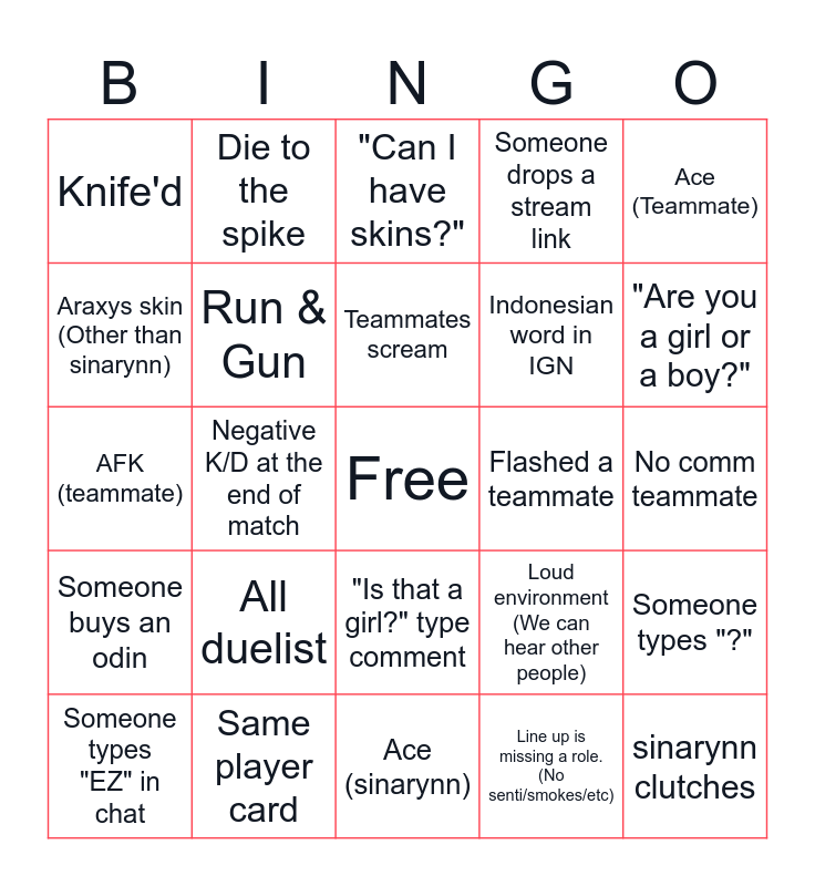 This bingo card has a free space and 44 words: Win pistol, sinarynn clutches, Instalock Jett, Someone types "EZ" in chat, Teammate drops a slur..., Line up is missing a role. (No senti/smokes/etc), "Can I have skins?", Gets 5-0'd, Ace (Teammate), Same player card, Someone drops a stream link, Flashed a teammate, "Is that a girl?" type comment, All duelist, Uses ultimate, Ace (sinarynn), sinarynn MVP'd, AFK (teammate), Ends the game with 0 kills, "Are you a girl or a boy?", Die to the spike, Same title, SUS username, Knife'd, Killed from behind, No comm teammate, Positive K/D at the end of the match, Someone T-Bags, Loud environment (We can hear other people), Someone buys an odin, Gets killed by a shotgun, Someone types "?", Someone else types gg, Teammates say nt, Negative K/D at the end of match, Classic + Regen shield, Second round Outlaw, Teammates don't rotate, Teammates scream, Araxys skin (Other than sinarynn), Indonesian word in IGN, Picks up enemy weapon, Run & Gun and Kill through smoke.