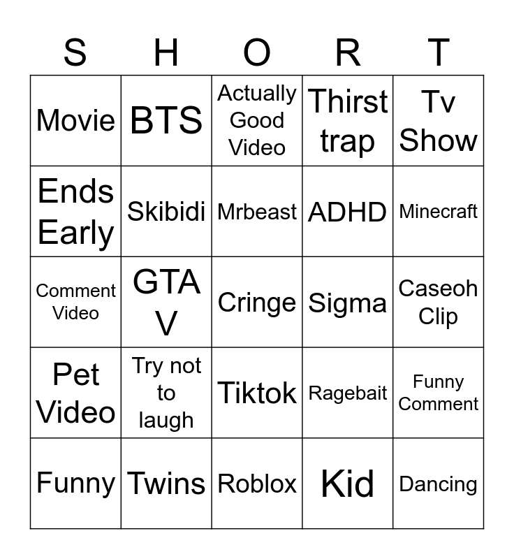 This bingo card has a free space and 24 words: Try not to laugh, Twins, Mrbeast, Funny, Tv Show, Movie, Ends Early, BTS, Sigma, Tiktok, ADHD, Comment Video, Ragebait, Funny Comment, Skibidi, Kid, Caseoh Clip, Actually Good Video, Minecraft, GTA V, Dancing, Pet Video, Thirst trap and Roblox.