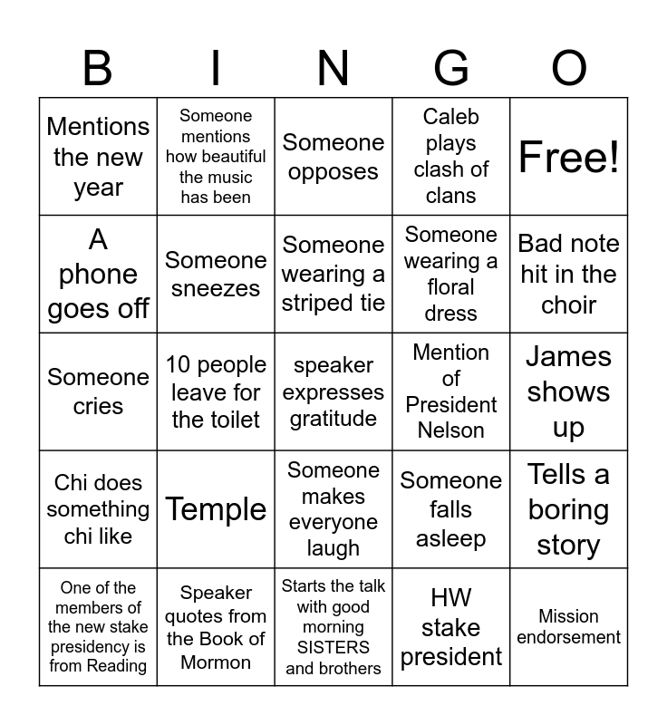 This bingo card has a free space and 24 words: Temple, Speaker quotes from the Book of Mormon, Someone wearing a striped tie, One of the members of the new stake presidency is from Reading, Free!, Mentions the new year, A phone goes off, Someone mentions how beautiful the music has been, Mention of President Nelson, Someone makes everyone laugh, Someone wearing a floral dress, Someone cries, Someone falls asleep, Tells a boring story, Someone sneezes, HW stake president, James shows up, Someone opposes, Bad note hit in the choir, 10 people leave for the toilet, Mission endorsement, Chi does something chi like, Caleb plays clash of clans and Starts the talk with good morning SISTERS and brothers.