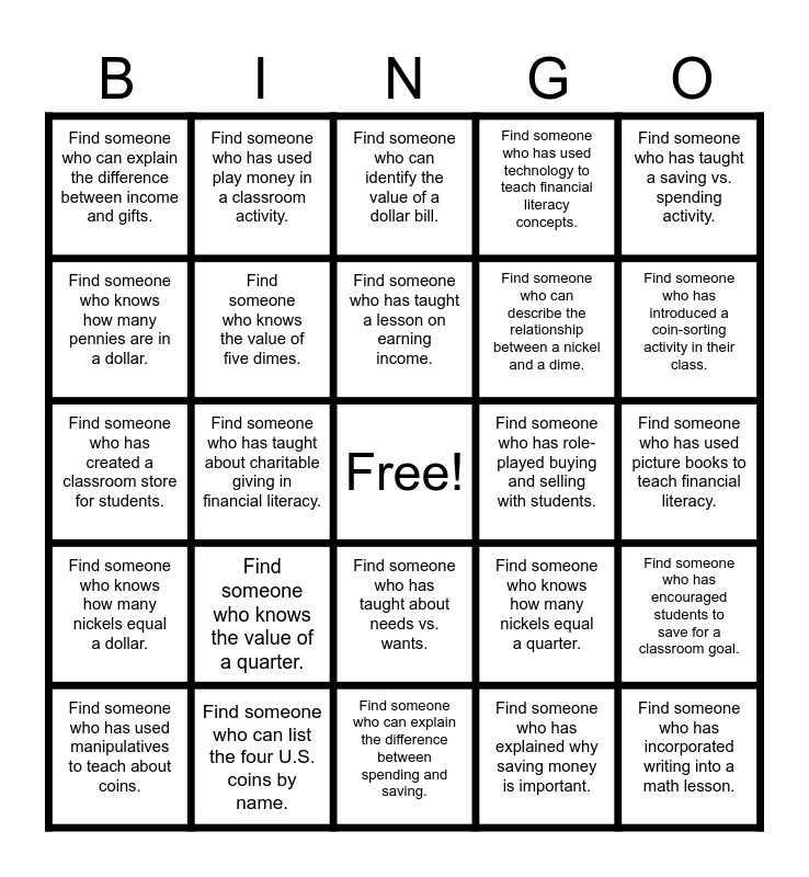 This bingo card has a free space and 24 words: Find someone who knows the value of a quarter., Find someone who can list the four U.S. coins by name., Find someone who has taught a lesson on earning income., Find someone who has used manipulatives to teach about coins., Find someone who has taught a saving vs. spending activity., Find someone who can explain the difference between income and gifts., Find someone who knows how many pennies are in a dollar., Find someone who has used play money in a classroom activity., Find someone who has role-played buying and selling with students., Find someone who has taught about needs vs. wants., Find someone who can describe the relationship between a nickel and a dime., Find someone who has created a classroom store for students., Find someone who knows how many nickels equal a quarter., Find someone who has encouraged students to save for a classroom goal., Find someone who knows the value of five dimes., Find someone who has explained why saving money is important., Find someone who has used picture books to teach financial literacy., Find someone who can identify the value of a dollar bill., Find someone who has introduced a coin-sorting activity in their class., Find someone who has taught about charitable giving in financial literacy., Find someone who has incorporated writing into a math lesson., Find someone who knows how many nickels equal a dollar., Find someone who has used technology to teach financial literacy concepts. and Find someone who can explain the difference between spending and saving..