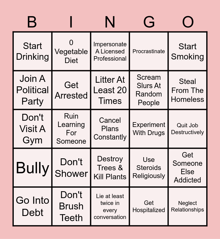 This bingo card has a free space and 24 words: Don't Shower, Don't Brush Teeth, Litter At Least 20 Times, Go Into Debt, Start Smoking, Start Drinking, Join A Political Party, 0 Vegetable Diet, Experiment With Drugs, Destroy Trees & Kill Plants, Scream Slurs At Random People, Don't Visit A Gym, Use Steroids Religiously, Get Someone Else Addicted, Get Arrested, Get Hospitalized, Quit Job Destructively, Impersonate A Licensed Professional, Steal From The Homeless, Ruin Learning For Someone, Neglect Relationships, Bully, Procrastinate and Lie at least twice in every conversation.