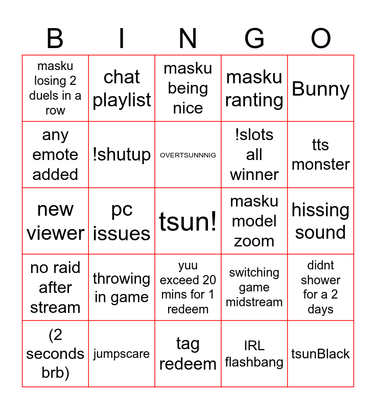 This bingo card has a free space and 24 words: throwing in game, jumpscare, OVERTSUNNNIG, (2 seconds brb), Bunny, masku losing 2 duels in a row, any emote added, chat playlist, masku model zoom, yuu exceed 20 mins for 1 redeem, !slots all winner, new viewer, switching game midstream, didnt shower for a 2 days, !shutup, IRL flashbang, hissing sound, masku being nice, tts monster, pc issues, tsunBlack, no raid after stream, masku ranting and tag redeem.