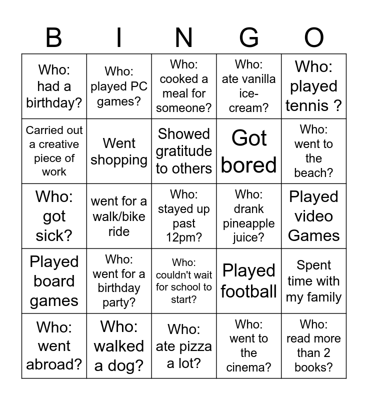 This bingo card has a free space and 44 words: Who: went swimming?, Who: read more than 2 books?, Who: visited a relative?, Who: went abroad?, Who: learned something new?, Who: went to the cinema?, Who: cooked a meal for someone?, Who: slept past noon?, Who: played tennis ?, Who: walked a dog?, Who: ate vanilla ice-cream?, Who: drank pineapple juice?, Who: couldn't wait for school to start?, Who: went for a birthday party?, Who: had a sleep-over?, Who: ate pizza a lot?, Who: got a haircut ?, Who: got sick?, Who: flew abroad?, Who: went to the beach?, Who: played PC games?, Who: got bored?, Who: watched Netflix?, Who: had a birthday?, Visited family members, Played video Games, Prayed all Salahs, Helped in the household, Played football, Played board games, Cooked for my family, Spent time with my family, Helped my neighbour, Visited a family member who was sick, went for a walk/bike ride, Went abraod, Had a pyjama day, Hugged parents/carers everyday, Showed gratitude to others, Carried out a creative piece of work, Got bored, Prayed Quran daily, Went shopping and saw teachers in the holiday.