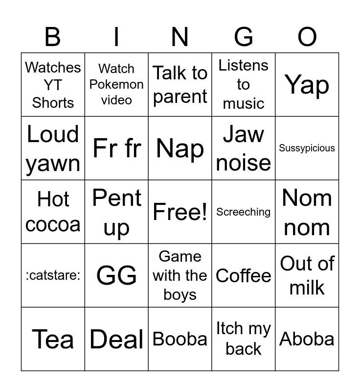 This bingo card has a free space and 24 words: GG, Deal, Nap, Tea, Yap, Watches YT Shorts, Loud yawn, Watch Pokemon video, Screeching, Game with the boys, Jaw noise, Hot cocoa, Coffee, Out of milk, Fr fr, Itch my back, Nom nom, Talk to parent, Sussypicious, Pent up, Aboba, :catstare:, Listens to music and Booba.