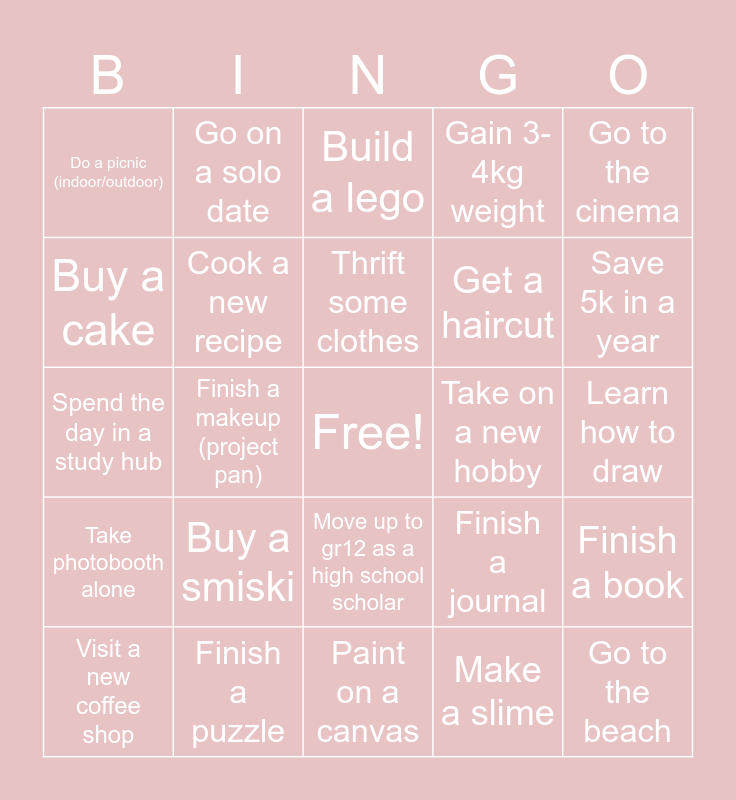 This bingo card has a free space and 24 words: Visit a new coffee shop, Buy a smiski, Thrift some clothes, Make a slime, Go to the cinema, Do a picnic (indoor/outdoor), Go on a solo date, Build a lego, Take on a new hobby, Learn how to draw, Spend the day in a study hub, Cook a new recipe, Finish a journal, Finish a book, Buy a cake, Finish a puzzle, Paint on a canvas, Gain 3-4kg weight, Save 5k in a year, Take photobooth alone, Finish a makeup (project pan), Move up to gr12 as a high school scholar, Get a haircut and Go to the beach.