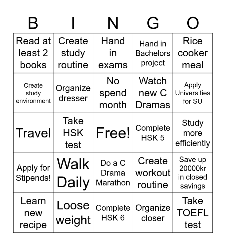 This bingo card has a free space and 24 words: Walk Daily, Loose weight, No spend month, Learn new recipe, Rice cooker meal, Read at least 2 books, Create study environment, Create study routine, Complete HSK 5, Do a C Drama Marathon, Watch new C Dramas, Travel, Create workout routine, Save up 20000kr in closed savings, Organize dresser, Organize closer, Study more efficiently, Hand in exams, Apply Universities for SU, Take HSK test, Take TOEFL test, Apply for Stipends!, Hand in Bachelors project and Complete HSK 6.