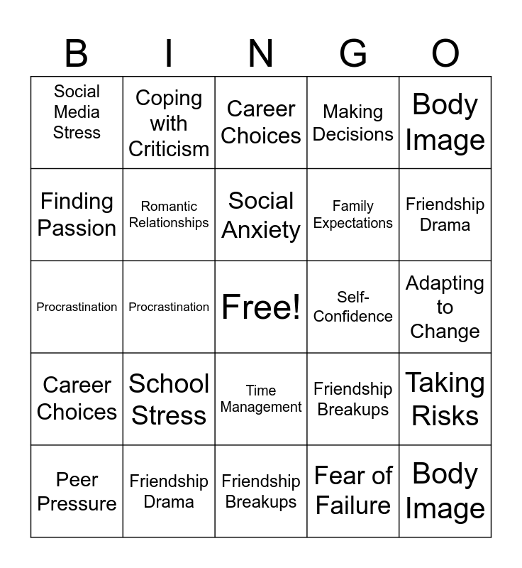 This bingo card has a free space and 29 words: Peer Pressure, Family Expectations, Procrastination, Time Management, Social Media Stress, Career Choices, Romantic Relationships, School Stress, Self- Confidence, Friendship Drama, Adapting to Change, Body Image, Friendship Breakups, Fear of Failure, Friendship Drama, Peer Pressure, Time Management, Career Choices, Body Image, Procrastination, Friendship Breakups, Self- Confidence, Family Expectations, Finding Passion, Making Decisions, Coping with Criticism, Taking Risks, Social Anxiety and Overcoming Doubt.
