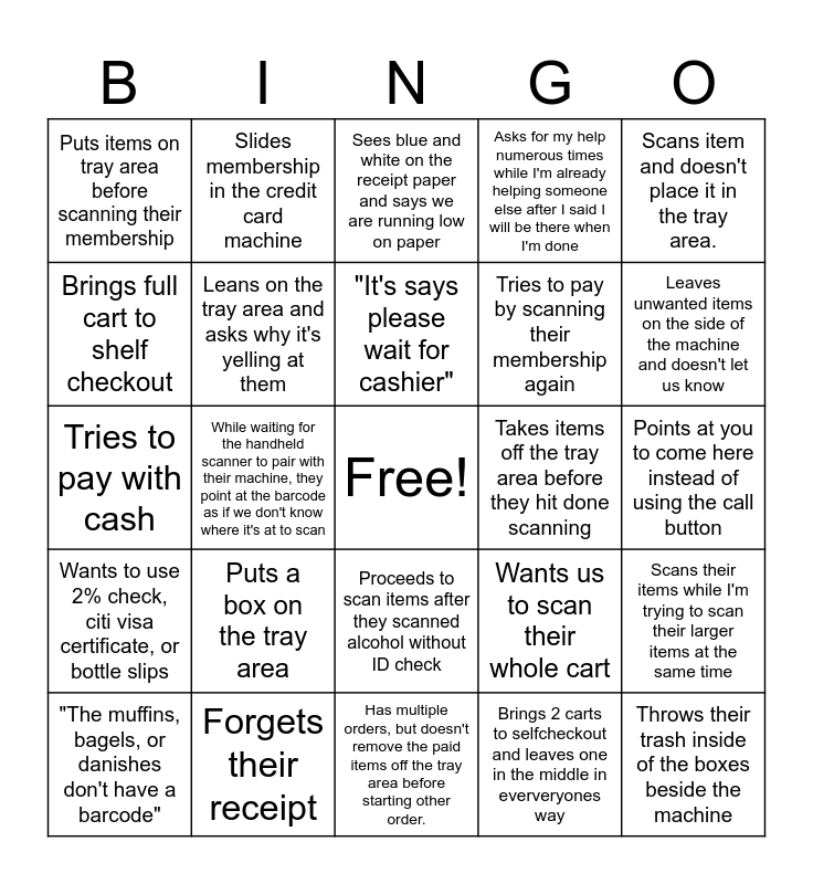 This bingo card has a free space and 24 words: Puts a box on the tray area, Forgets their receipt, "It's says please wait for cashier", "The muffins, bagels, or danishes don't have a barcode", Scans item and doesn't place it in the tray area., Puts items on tray area before scanning their membership, Brings full cart to shelf checkout, Slides membership in the credit card machine, Takes items off the tray area before they hit done scanning, Proceeds to scan items after they scanned alcohol without ID check, Tries to pay by scanning their membership again, Tries to pay with cash, Wants us to scan their whole cart, Scans their items while I'm trying to scan their larger items at the same time, Leans on the tray area and asks why it's yelling at them, Brings 2 carts to selfcheckout and leaves one in the middle in eververyones way, Points at you to come here instead of using the call button, Sees blue and white on the receipt paper and says we are running low on paper, Leaves unwanted items on the side of the machine and doesn't let us know, While waiting for the handheld scanner to pair with their machine, they point at the barcode as if we don't know where it's at to scan, Throws their trash inside of the boxes beside the machine, Wants to use 2% check, citi visa certificate, or bottle slips, Asks for my help numerous times while I'm already helping someone else after I said I will be there when I'm done and Has multiple orders, but doesn't remove the paid items off the tray area before starting other order..