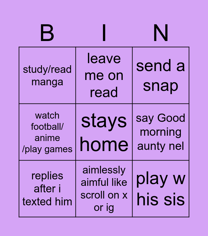 This bingo card has a free space and 8 words: say Good morning aunty nel, send a snap, leave me on read, replies after i texted him, study/read manga, play w his sis, watch football/ anime /play games and aimlessly aimful like scroll on x or ig.