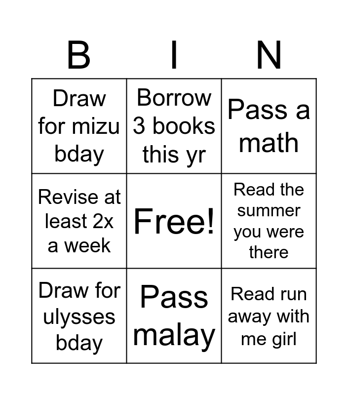 This bingo card has a free space and 8 words: Read the summer you were there, Pass a math, Borrow 3 books this yr, Draw for ulysses bday, Draw for mizu bday, Read run away with me girl, Revise at least 2x a week and Pass malay.
