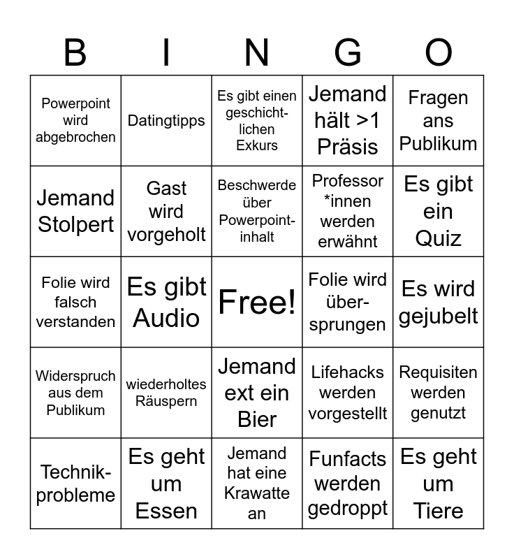 This bingo card has a free space and 24 words: wiederholtes Räuspern, Es geht um Essen, Beschwerde über Powerpoint- inhalt, Technik- probleme, Fragen ans Publikum, Powerpoint wird abgebrochen, Jemand Stolpert, Datingtipps, Folie wird über- sprungen, Jemand ext ein Bier, Professor *innen werden erwähnt, Folie wird falsch verstanden, Lifehacks werden vorgestellt, Requisiten werden genutzt, Gast wird vorgeholt, Funfacts werden gedroppt, Es wird gejubelt, Es gibt einen geschicht- lichen Exkurs, Es gibt ein Quiz, Es gibt Audio, Es geht um Tiere, Widerspruch aus dem Publikum, Jemand hält >1 Präsis and Jemand hat eine Krawatte an.