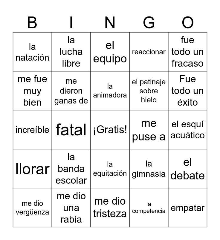 This bingo card has a free space and 42 words: animar, la animadora, el atletismo, la banda escolar, la competencia, el debate, empatar, el entrenador, el equipo, la equitación, el esquí acuático, Fue todo un éxito, fatal, fue todo un fracaso, ganar, la gimnasia, el golf, increíble, el jugador, la lucha libre, me fue muy bien, me fue muy mal, montar a caballo, la natación, la oratoria, el patinaje en linea, el patinaje sobre hielo, perder, el puntaje, el trofeo, gritar, llorar, me dieron ganas de, me dio tristeza, me dio alegría, me dio vergüenza, me dio una rabia, me puse a, me puse, me reí mucho, reaccionar and reírse.