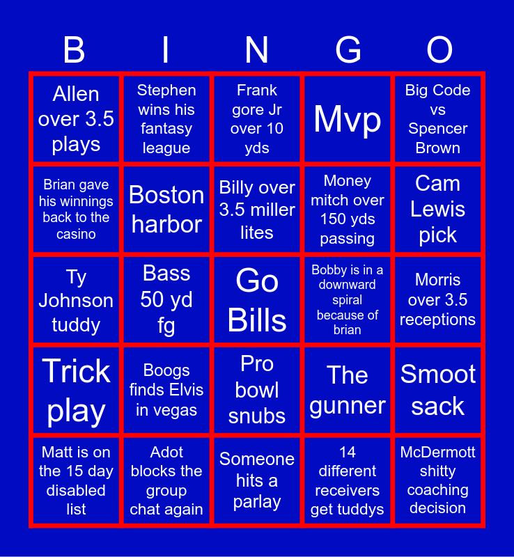 This bingo card has a free space and 24 words: Boogs finds Elvis in vegas, Adot blocks the group chat again, Billy over 3.5 miller lites, Matt is on the 15 day disabled list, Big Code vs Spencer Brown, Allen over 3.5 plays, Brian gave his winnings back to the casino, Stephen wins his fantasy league, Bobby is in a downward spiral because of brian, Pro bowl snubs, Money mitch over 150 yds passing, Ty Johnson tuddy, The gunner, Smoot sack, Boston harbor, 14 different receivers get tuddys, Morris over 3.5 receptions, Frank gore Jr over 10 yds, Cam Lewis pick, Bass 50 yd fg, McDermott shitty coaching decision, Trick play, Mvp and Someone hits a parlay.