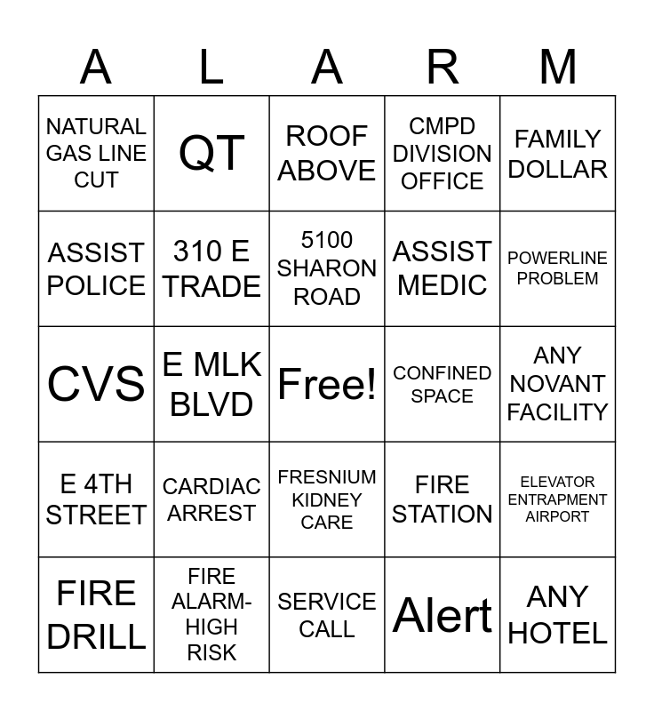 This bingo card has a free space and 32 words: Alert, AMF *DELTA, E MLK BLVD, SPRATT STREET, E 4TH STREET, 310 E TRADE, FAMILY DOLLAR, ELEVATOR ENTRAPMENT AIRPORT, QT, ANY ATRIUM FACILITY, 5100 SHARON ROAD, ROOF ABOVE, MVA, BUS STOP, CONFINED SPACE, CIRCLE K, FIRE DRILL, CVS, FRESNIUM KIDNEY CARE, CARDIAC ARREST, FIRE STATION, WALMART, ANY NOVANT FACILITY, FIRE ALARM-HIGH RISK, ANY HOTEL, CMPD DIVISION OFFICE, ASSIST MEDIC, ASSIST POLICE, NATURAL GAS LINE CUT, SERVICE CALL, OOS APPARATUS and POWERLINE PROBLEM.