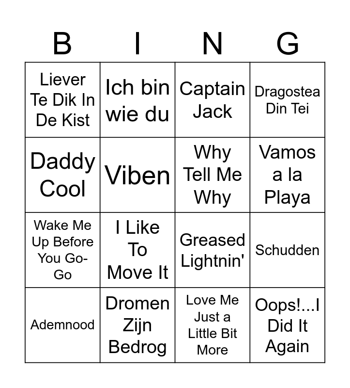 This bingo card has 45 words: 99 Luftballons, Ademnood, Anton aus Tirol, Atje Voor De Sfeer, Bewegen is Gezond, Boom, Boom, Boom, Boom!!, Captain Jack, Casanova, Daddy Cool, Ding Dong Song, Dragostea Din Tei, Dromen Zijn Bedrog, Dromendans, Eye of the Tiger, Follow The Leader, Funkytown, Girls Just Want to Have Fun, Greased Lightnin', Heb Je Even Voor Mij, I Like To Move It, Ich bin wie du, La Bomba, Leef, Liever Te Dik In De Kist, Links Rechts, Love Me Just a Little Bit More, Macarena, Mexico, Narcotic, Oops!...I Did It Again, Paloma Blanca, Paradise by the Dashboard Light, Que Si, Que No, Rainbow In The Sky, Rampeneren, Schudden, Take on Me, Total Eclipse of the Heart, Uptown Girl, Vamos a la Playa, Viben, Wake Me Up Before You Go-Go, Waterloo, Why Tell Me Why and YMCA.