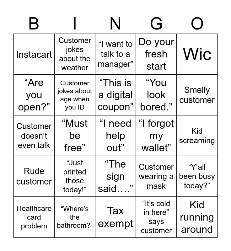This bingo card has a free space and 24 words: “Just printed those today!”, “Where’s the bathroom?”, “This is a digital coupon”, Healthcare card problem, Wic, Instacart, “Are you open?”, Customer jokes about the weather, “I forgot my wallet”, “The sign said….”, “You look bored.”, Customer doesn’t even talk, Customer wearing a mask, “Y’all been busy today?”, Customer jokes about age when you ID, “It’s cold in here” says customer, Kid screaming, “I want to talk to a manager”, Smelly customer, “Must be free”, Kid running around, Rude customer, Do your fresh start and Tax exempt.