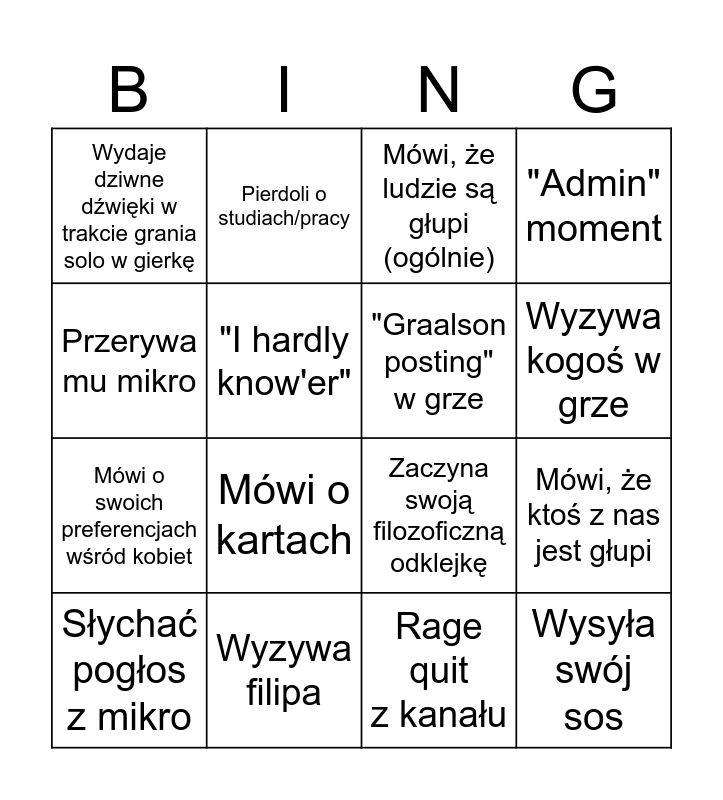 This bingo card has 16 words: Wyzywa filipa, Mówi, że ktoś z nas jest głupi, Mówi, że ludzie są głupi (ogólnie), Wydaje dziwne dźwięki w trakcie grania solo w gierkę, Mówi o swoich preferencjach wśród kobiet, Pierdoli o studiach/pracy, Zaczyna swoją filozoficzną odklejkę, Rage quit z kanału, Przerywa mu mikro, "I hardly know'er", Słychać pogłos z mikro, "Admin" moment, Mówi o kartach, Wyzywa kogoś w grze, "Graalson posting" w grze and Wysyła swój sos.