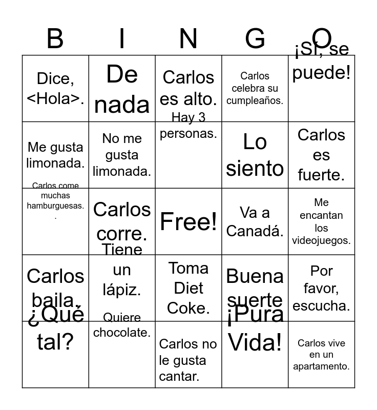 This bingo card has a free space and 24 words: Tiene un lápiz., Quiere chocolate., Hay 3 personas., ¿Qué tal?, ¡Sí, se puede!, Dice, <Hola>., Me gusta limonada., De nada, Va a Canadá., Toma Diet Coke., Lo siento, Carlos come muchas hamburguesas. ., Buena suerte, Por favor, escucha., No me gusta limonada., ¡Pura Vida!, Me encantan los videojuegos., Carlos es alto., Carlos es fuerte., Carlos corre., Carlos vive en un apartamento., Carlos baila., Carlos celebra su cumpleaños. and Carlos no le gusta cantar..