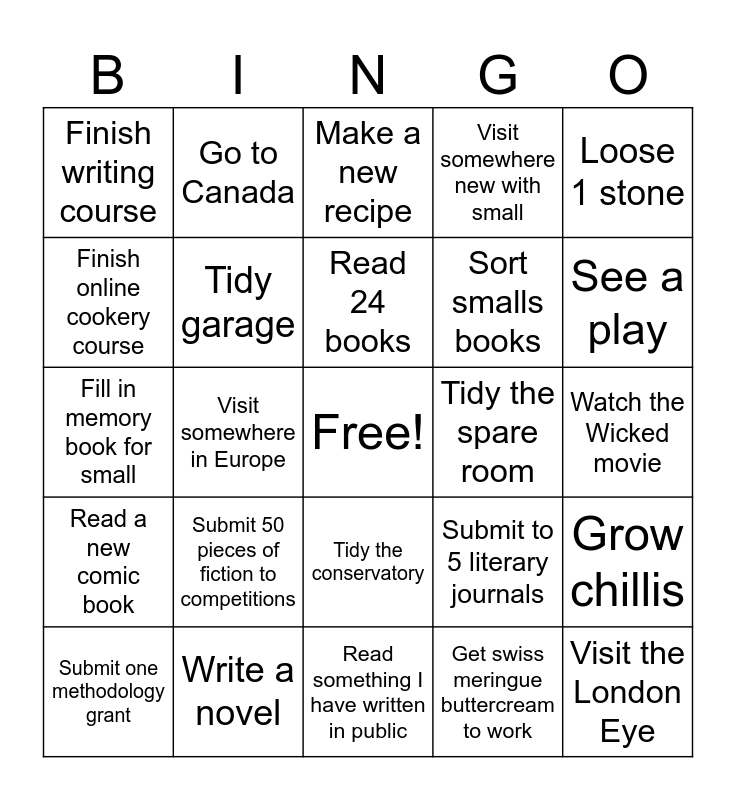 This bingo card has a free space and 24 words: Submit 50 pieces of fiction to competitions, Write a novel, Read 24 books, Submit one methodology grant, Loose 1 stone, Finish writing course, Finish online cookery course, Go to Canada, Tidy the spare room, Tidy the conservatory, Sort smalls books, Fill in memory book for small, Submit to 5 literary journals, Grow chillis, Tidy garage, Get swiss meringue buttercream to work, Watch the Wicked movie, Make a new recipe, See a play, Visit somewhere in Europe, Visit the London Eye, Read a new comic book, Visit somewhere new with small and Read something I have written in public.