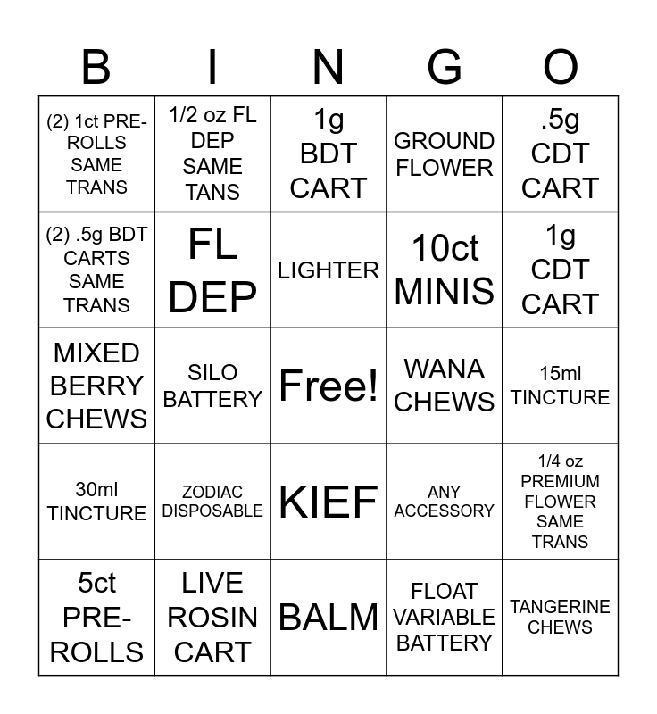 This bingo card has a free space and 24 words: ZODIAC DISPOSABLE, LIVE ROSIN CART, LIGHTER, 5ct PRE-ROLLS, .5g CDT CART, (2) 1ct PRE-ROLLS SAME TRANS, (2) .5g BDT CARTS SAME TRANS, 1/2 oz FL DEP SAME TANS, WANA CHEWS, KIEF, 10ct MINIS, MIXED BERRY CHEWS, ANY ACCESSORY, 1/4 oz PREMIUM FLOWER SAME TRANS, FL DEP, FLOAT VARIABLE BATTERY, 15ml TINCTURE, 1g BDT CART, 1g CDT CART, SILO BATTERY, TANGERINE CHEWS, 30ml TINCTURE, GROUND FLOWER and BALM.