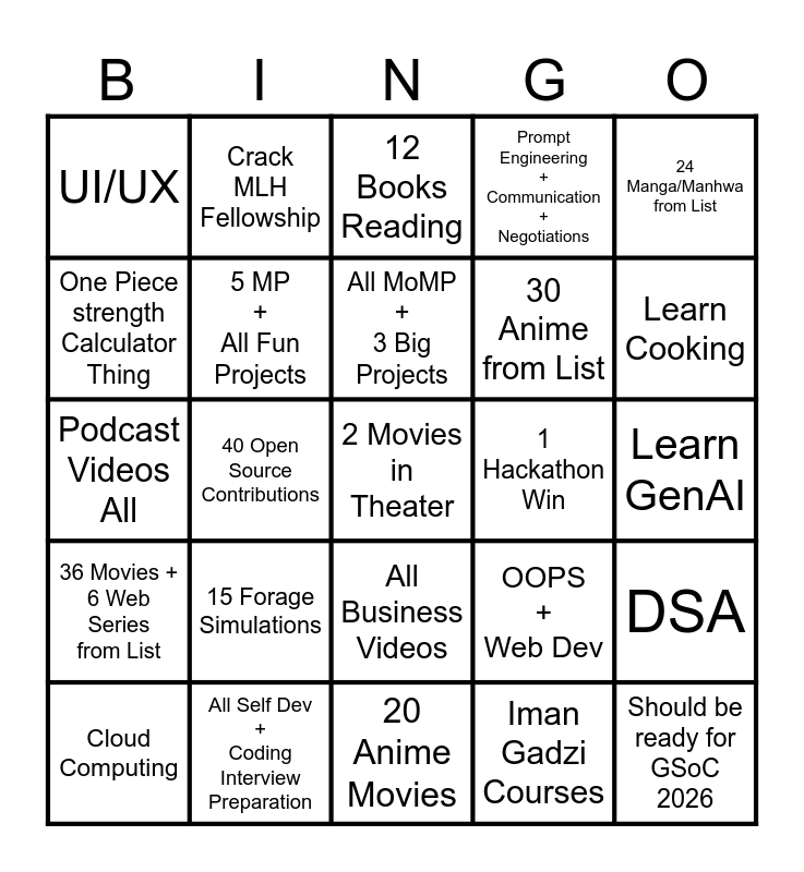 This bingo card has 25 words: 15 Forage Simulations, 20 Anime Movies, All MoMP + 3 Big Projects, Cloud Computing, 24 Manga/Manhwa from List, UI/UX, One Piece strength Calculator Thing, Crack MLH Fellowship, 1 Hackathon Win, All Business Videos, 30 Anime from List, Podcast Videos All, OOPS + Web Dev, DSA, 5 MP + All Fun Projects, Should be ready for GSoC 2026, Learn GenAI, 12 Books Reading, Learn Cooking, 40 Open Source Contributions, 2 Movies in Theater, All Self Dev + Coding Interview Preparation, 36 Movies + 6 Web Series from List, Prompt Engineering + Communication + Negotiations and Iman Gadzi Courses.