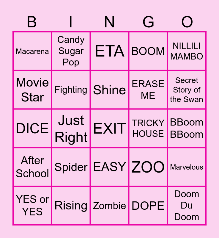 This bingo card has 51 words: Free!, EXIT, CROWN, Zombie, Spider, Ride the Vibe, Candy Sugar Pop, Lotto, Movie Star, Inception, Fighting, BOOM, Marvelous, ZOO, KILLING ME, MIROH, Shine, TRICKY HOUSE, JIKJIN, NILLILI MAMBO, Just Right, DOPE, Macarena, ERASE ME, LIP GLOSS, Doom Du Doom, Secret Story of the Swan, Spicy, YES or YES, ETA, Lovesick Girls, Virtual Angel, Wow Thing, Beautiful Monster, WE GO, Rising, Bon Bon Chocolat, Up!, NEMONEMO, LOCO, BBoom BBoom, After School, DRIP, MAGO, Feel My Rhythm, Tell Me, DICE, Whiplash, Sticky, EASY and Step Back.