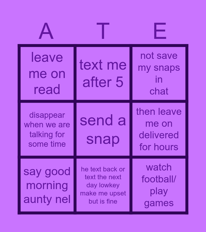 This bingo card has 9 words: say good morning aunty nel, send a snap, not save my snaps in chat, leave me on read, text me after 5, then leave me on delivered for hours, disappear when we are talking for some time, he text back or text the next day lowkey make me upset but is fine and watch football/ play games.