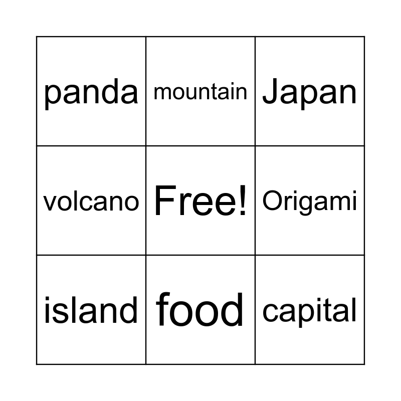 This bingo card has a free space and 14 words: Japan, Asia, island, mountain, volcano, capital, famous, culture, food, panda, Mount Fuji, Origami, Japan and Japan.