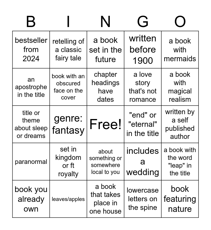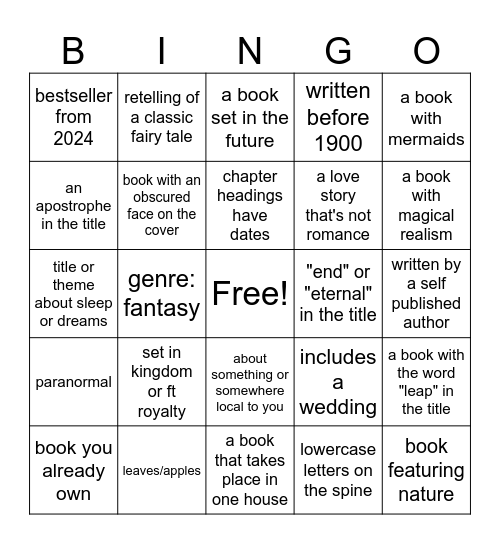 This bingo card has a free space and 24 words: set in kingdom or ft royalty, leaves/apples, chapter headings have dates, book you already own, a book with mermaids, bestseller from 2024, an apostrophe in the title, retelling of a classic fairy tale, "end" or "eternal" in the title, about something or somewhere local to you, a love story that's not romance, title or theme about sleep or dreams, includes a wedding, a book with the word "leap" in the title, book with an obscured face on the cover, lowercase letters on the spine, written by a self published author, a book set in the future, a book with magical realism, genre: fantasy, book featuring nature, paranormal, written before 1900 and a book that takes place in one house.