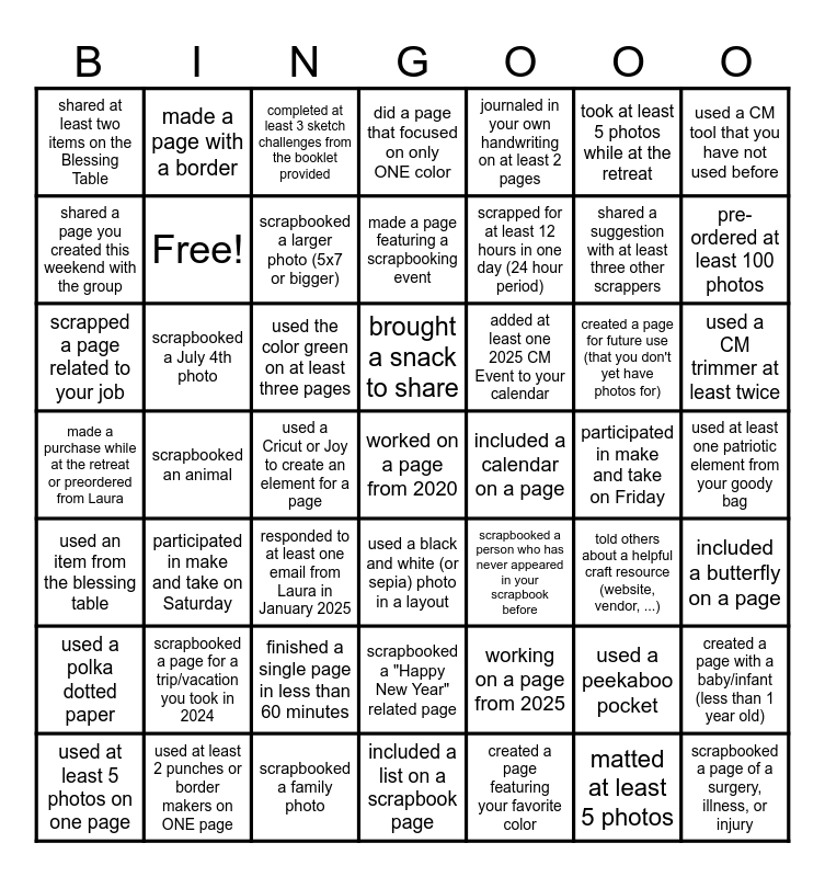 This bingo card has a free space and 48 words: working on a page from 2025, shared a suggestion with at least three other scrappers, included a list on a scrapbook page, scrapbooked an animal, used the color green on at least three pages, used at least one patriotic element from your goody bag, made a page with a border, used at least 2 punches or border makers on ONE page, took at least 5 photos while at the retreat, used a black and white (or sepia) photo in a layout, used a CM tool that you have not used before, did a page that focused on only ONE color, created a page for future use (that you don't yet have photos for), added at least one 2025 CM Event to your calendar, used a polka dotted paper, participated in make and take on Friday, shared a page you created this weekend with the group, pre-ordered at least 100 photos, used a peekaboo pocket, journaled in your own handwriting on at least 2 pages, scrapped for at least 12 hours in one day (24 hour period), used a Cricut or Joy to create an element for a page, shared at least two items on the Blessing Table, Free!, created a page with a baby/infant (less than 1 year old), scrapbooked a larger photo (5x7 or bigger), used a CM trimmer at least twice, used at least 5 photos on one page, brought a snack to share, scrapbooked a July 4th photo, matted at least 5 photos, included a calendar on a page, included a butterfly on a page, scrapbooked a page for a trip/vacation you took in 2024, made a purchase while at the retreat or preordered from Laura, scrapbooked a person who has never appeared in your scrapbook before, told others about a helpful craft resource (website, vendor, ...), scrapped a page related to your job, responded to at least one email from Laura in January 2025, finished a single page in less than 60 minutes, used an item from the blessing table, scrapbooked a page of a surgery, illness, or injury, completed at least 3 sketch challenges from the booklet provided, scrapbooked a family photo, made a page featuring a scrapbooking event, scrapbooked a "Happy New Year" related page, participated in make and take on Saturday and created a page featuring your favorite color.