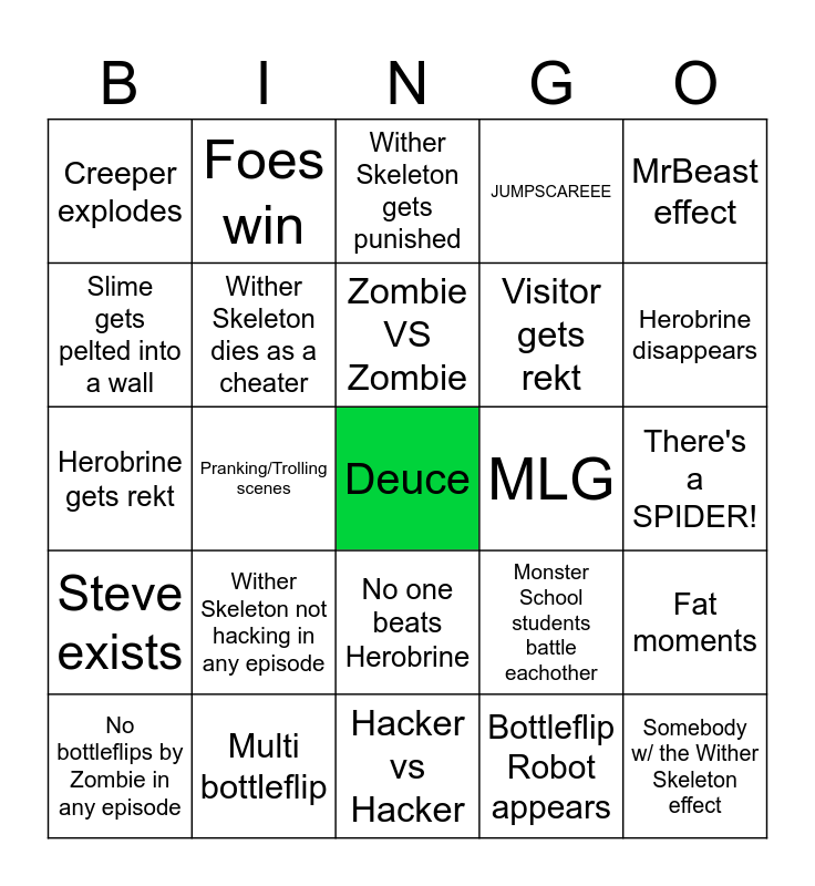 This bingo card has a free space and 24 words: No bottleflips by Zombie in any episode, Wither Skeleton not hacking in any episode, Zombie VS Zombie, Bottleflip Robot appears, MrBeast effect, Creeper explodes, Foes win, Wither Skeleton gets punished, MLG, There's a SPIDER!, Herobrine gets rekt, Wither Skeleton dies as a cheater, Monster School students battle eachother, Fat moments, Slime gets pelted into a wall, Multi bottleflip, Hacker vs Hacker, JUMPSCAREEE, Herobrine disappears, Steve exists, Pranking/Trolling scenes, No one beats Herobrine, Visitor gets rekt and Somebody w/ the Wither Skeleton effect.