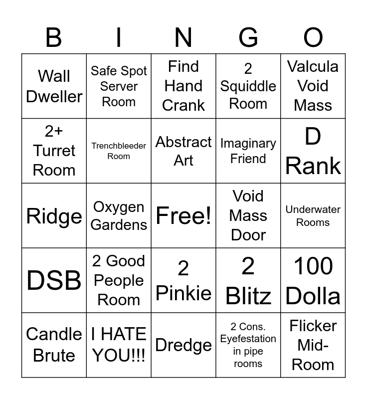 This bingo card has a free space and 29 words: Candle Brute, 2 Chain, Oxygen Gardens, Heavy Containment, Wall Dweller, Find Hand Crank, Trenchbleeder Room, 2 Good People Room, Void Mass Door, I HATE YOU!!!, Underwater Rooms, Flicker Mid-Room, Dredge, 2 Cons. Eyefestation in pipe rooms, D Rank, Big Fan Room, 2 Pinkie, DSB, Valcula Void Mass, Ridge, 2 Blitz, 2 Front Angler, Imaginary Friend, 2+ Turret Room, 2 Squiddle Room, Safe Spot Server Room, 100 Dolla, Abstract Art and 4+ Side rooms.