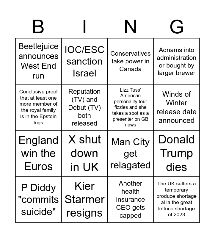 This bingo card has 16 words: Kier Starmer resigns, Donald Trump dies, Conservatives take power in Canada, Beetlejuice announces West End run, England win the Euros, IOC/ESC sanction Israel, Man City get relagated, Another health insurance CEO gets capped, Conclusive proof that at least one more member of the royal family is in the Epstein logs, Reputation (TV) and Debut (TV) both released, P Diddy "commits suicide", Adnams into administration or bought by larger brewer, X shut down in UK, Winds of Winter release date announced, Lizz Tuss’ American personality tour fizzles and she takes a spot as a presenter on GB news and The UK suffers a temporary produce shortage al la the great lettuce shortage of 2023.