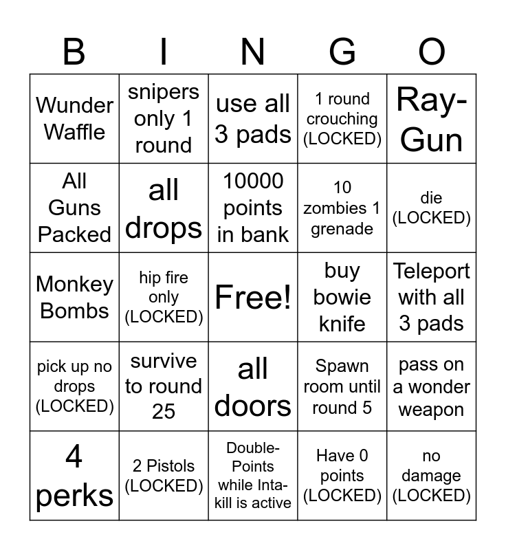 This bingo card has a free space and 25 words: survive to round 25, Double-Points while Inta-kill is active, 10000 points in bank, 4 perks, Ray-Gun, Wunder Waffle, All Guns Packed, snipers only 1 round, buy bowie knife, all doors, 10 zombies 1 grenade, Monkey Bombs, Spawn room until round 5, pass on a wonder weapon, all drops, 100 headshots, Teleport with all 3 pads, use all 3 pads, die (LOCKED), hip fire only (LOCKED), no damage (LOCKED), 2 Pistols (LOCKED), pick up no drops (LOCKED), 1 round crouching (LOCKED) and Have 0 points (LOCKED).