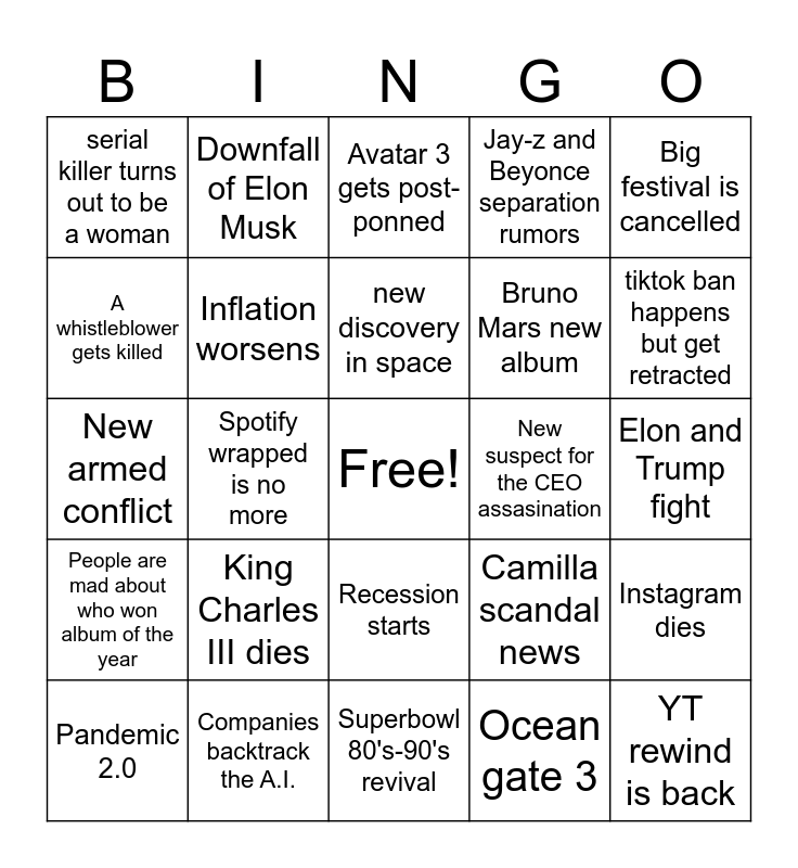 This bingo card has a free space and 24 words: King Charles III dies, Companies backtrack the A.I., new discovery in space, Pandemic 2.0, Big festival is cancelled, serial killer turns out to be a woman, A whistleblower gets killed, Downfall of Elon Musk, New suspect for the CEO assasination, Recession starts, Bruno Mars new album, New armed conflict, Camilla scandal news, Instagram dies, Inflation worsens, Ocean gate 3, Elon and Trump fight, Avatar 3 gets post-ponned, tiktok ban happens but get retracted, Spotify wrapped is no more, YT rewind is back, People are mad about who won album of the year, Jay-z and Beyonce separation rumors and Superbowl 80's-90's revival.