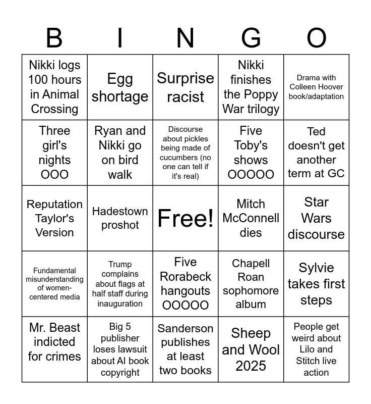 This bingo card has a free space and 24 words: Trump complains about flags at half staff during inauguration, Big 5 publisher loses lawsuit about AI book copyright, Discourse about pickles being made of cucumbers (no one can tell if it's real), Mr. Beast indicted for crimes, Drama with Colleen Hoover book/adaptation, Nikki logs 100 hours in Animal Crossing, Three girl's nights OOO, Egg shortage, Mitch McConnell dies, Five Rorabeck hangouts OOOOO, Five Toby's shows OOOOO, Reputation Taylor's Version, Chapell Roan sophomore album, Sylvie takes first steps, Ryan and Nikki go on bird walk, Sheep and Wool 2025, Star Wars discourse, Surprise racist, Ted doesn't get another term at GC, Hadestown proshot, People get weird about Lilo and Stitch live action, Fundamental misunderstanding of women-centered media, Nikki finishes the Poppy War trilogy and Sanderson publishes at least two books.
