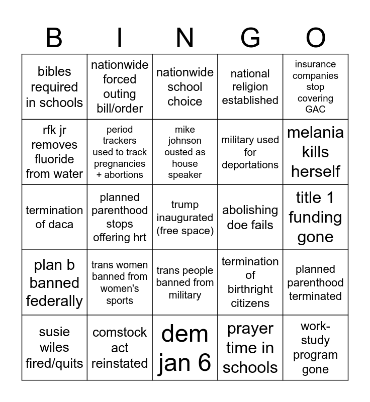 This bingo card has a free space and 24 words: trans women banned from women's sports, comstock act reinstated, mike johnson ousted as house speaker, susie wiles fired/quits, insurance companies stop covering GAC, bibles required in schools, rfk jr removes fluoride from water, nationwide forced outing bill/order, abolishing doe fails, trans people banned from military, military used for deportations, termination of daca, termination of birthright citizens, planned parenthood terminated, period trackers used to track pregnancies + abortions, prayer time in schools, title 1 funding gone, nationwide school choice, melania kills herself, planned parenthood stops offering hrt, work-study program gone, plan b banned federally, national religion established and dem jan 6.
