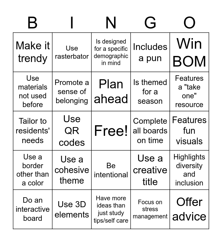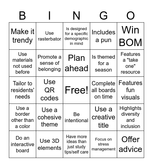 This bingo card has a free space and 24 words: Use a cohesive theme, Use 3D elements, Plan ahead, Do an interactive board, Win BOM, Make it trendy, Use materials not used before, Use rasterbator, Complete all boards on time, Be intentional, Is themed for a season, Tailor to residents' needs, Use a creative title, Highlights diversity and inclusion, Promote a sense of belonging, Focus on stress management, Features fun visuals, Is designed for a specific demographic in mind, Features a "take one" resource, Use QR codes, Offer advice, Use a border other than a color, Includes a pun and Have more ideas than just study tips/self care.